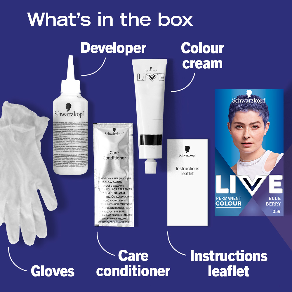 Feeling blue? Nothing better than LIVE Intense Colour Blue Berry 059 to help you achieve the perfect shade of cool toned blue. Suitable for all hair textures, from light blonde to dark blonde hair, our Intense Colour formula guarantees perfect grey coverage and vibrant, long-lasting results.